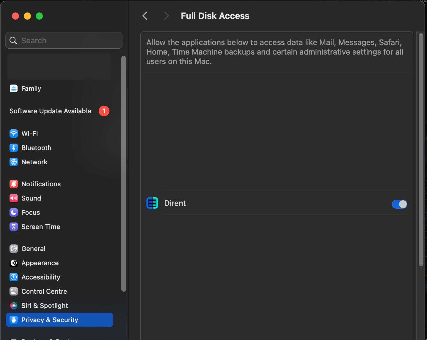 Granting this permission is optional and needed only for accessing certain system folders like Trash, Mail, and Safari, which require special permissions. If you wish for Dirent to operate within these folders, you need to manually enable this permission. Go to MacOS System Settings, then navigate to Privacy & Security -> Full Disk Access, and toggle the setting for Dirent.